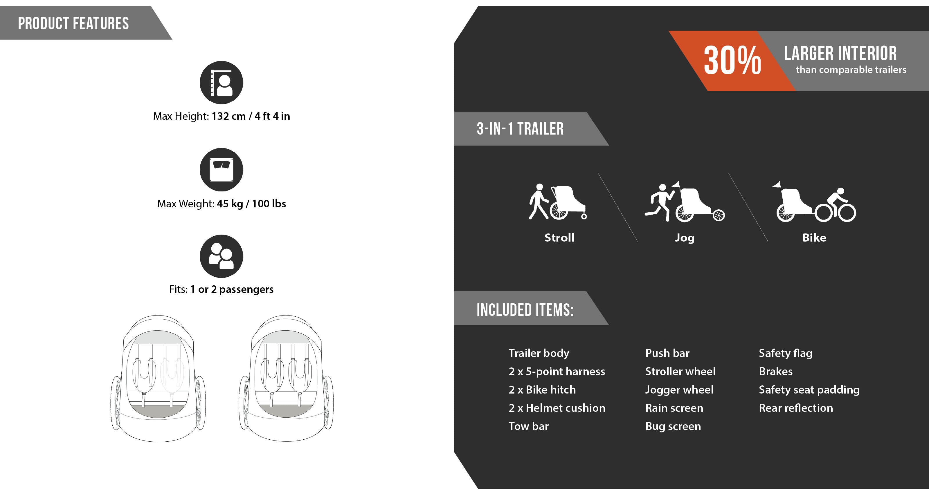 Wike Premium Double Children's Bike Trailer - Includes Stroller and Jogging Kit